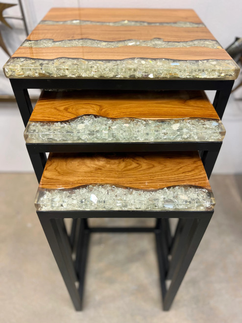 Three stacking tables made with teak and crushed glass with resin. High gloss finish rounds out our set of 3 elegant tables with black metal legs. Size is approximately 27.5"T x 15.5"W x 15.5"D.