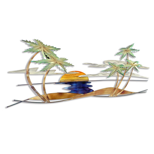 Tropical Palms swaying in the wind, is made from metal. This metal wall art is approx. 36 x 17 x 1.5" in size. Metal hangers are on the back for easy display. Swaying Tropical Palm Scene can be hung outdoors with some protection, like on a covered porch.