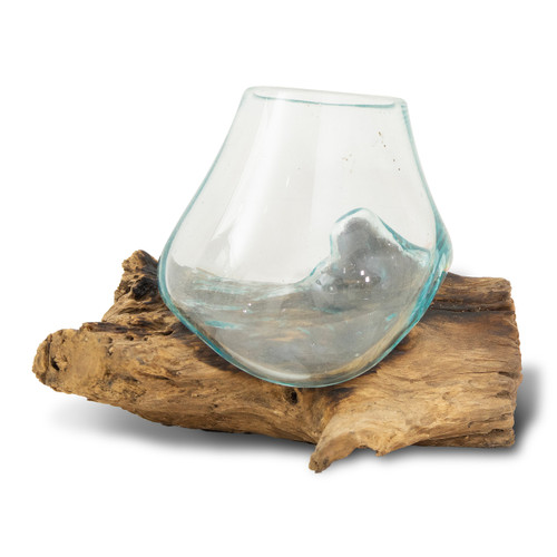 Our blown glass bowl formed on a natural wood base is the perfect accent for any table. Fill with a small plant, sand & shells, or a floating votive. Skilled artisans in Bali, Indonesia use Recycled Glass to hand blow these beautiful one of kind glass vessels directly on top of Gamal Root bases. No two will be exactly alike, all are hand blown glass. Product size is approximately 14 x 8 x 8"